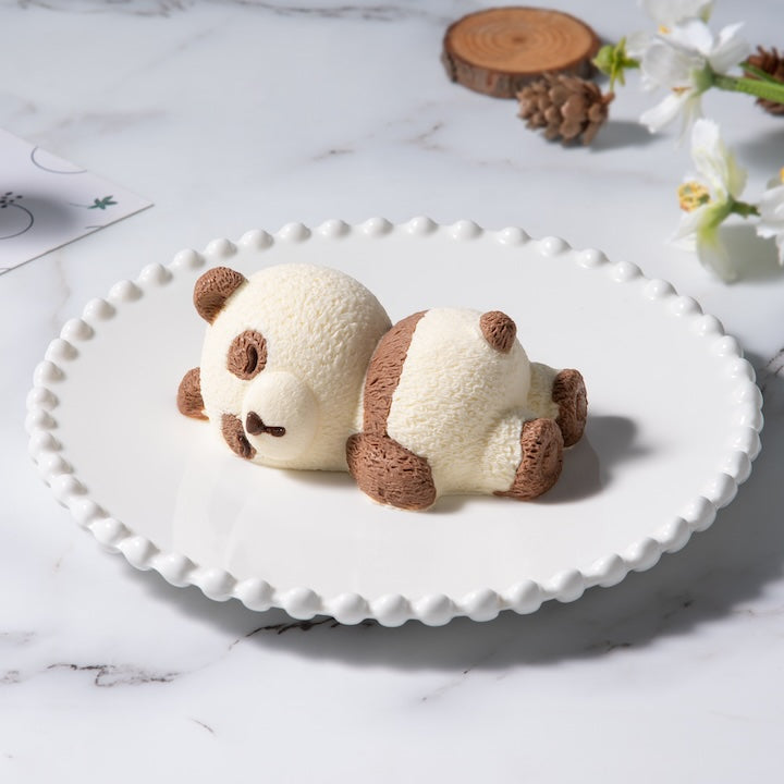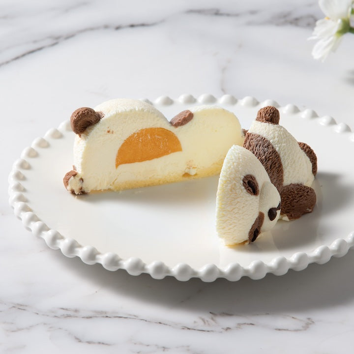 A bear-y cute grizzly bear made with white chocolate mousse, chocolate mousse, mango passion fruit filling, and a thin layer of chiffon cake.